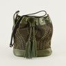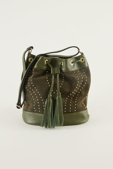 Bolso 100% de piel y ante con detalles circulares metálicos, estilo bombonera. Este modelo cuenta con un asa larga adaptable; que convierten este modelo en un aliado perfecto para cualquier tipo de outfit. Todos los detalles metálicos son de acero inoxidable acabado oro.