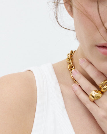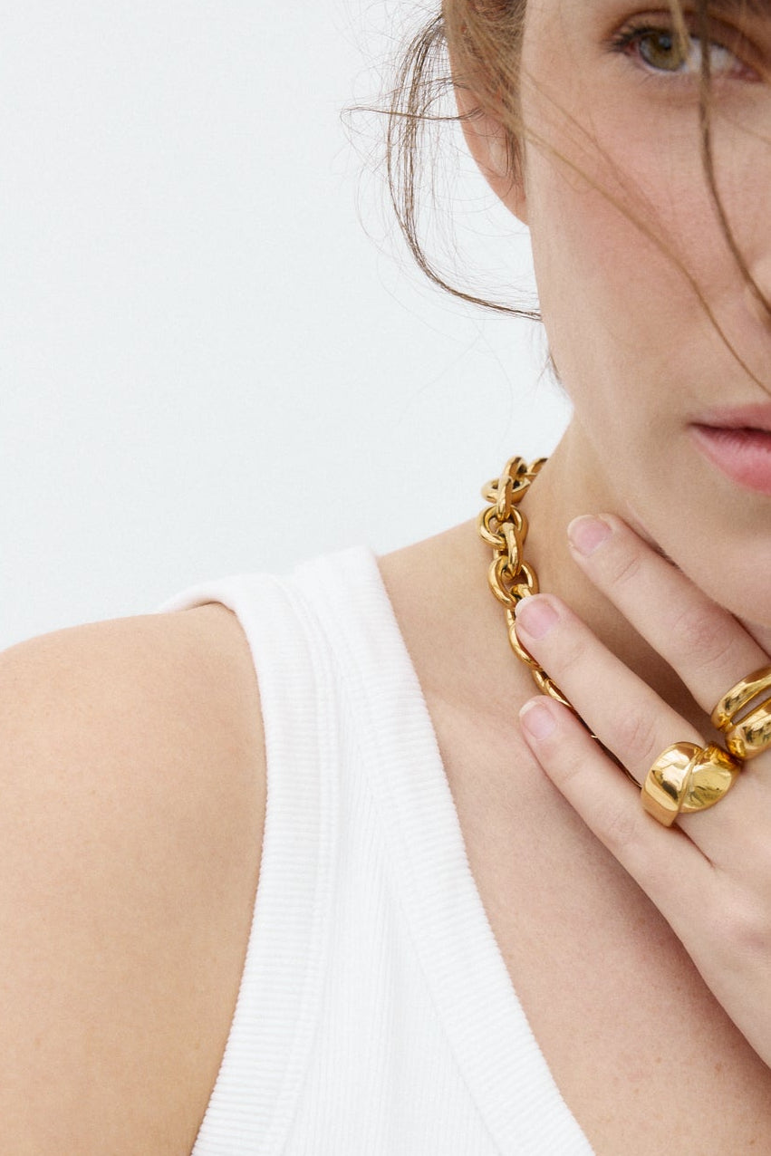 Anillo de diseño ancho con acabado dorado pulido. La pieza presenta una forma redondeada y estructurada que destaca por su superficie lisa y brillante.