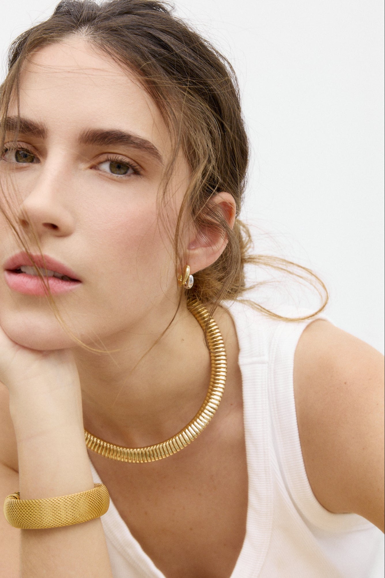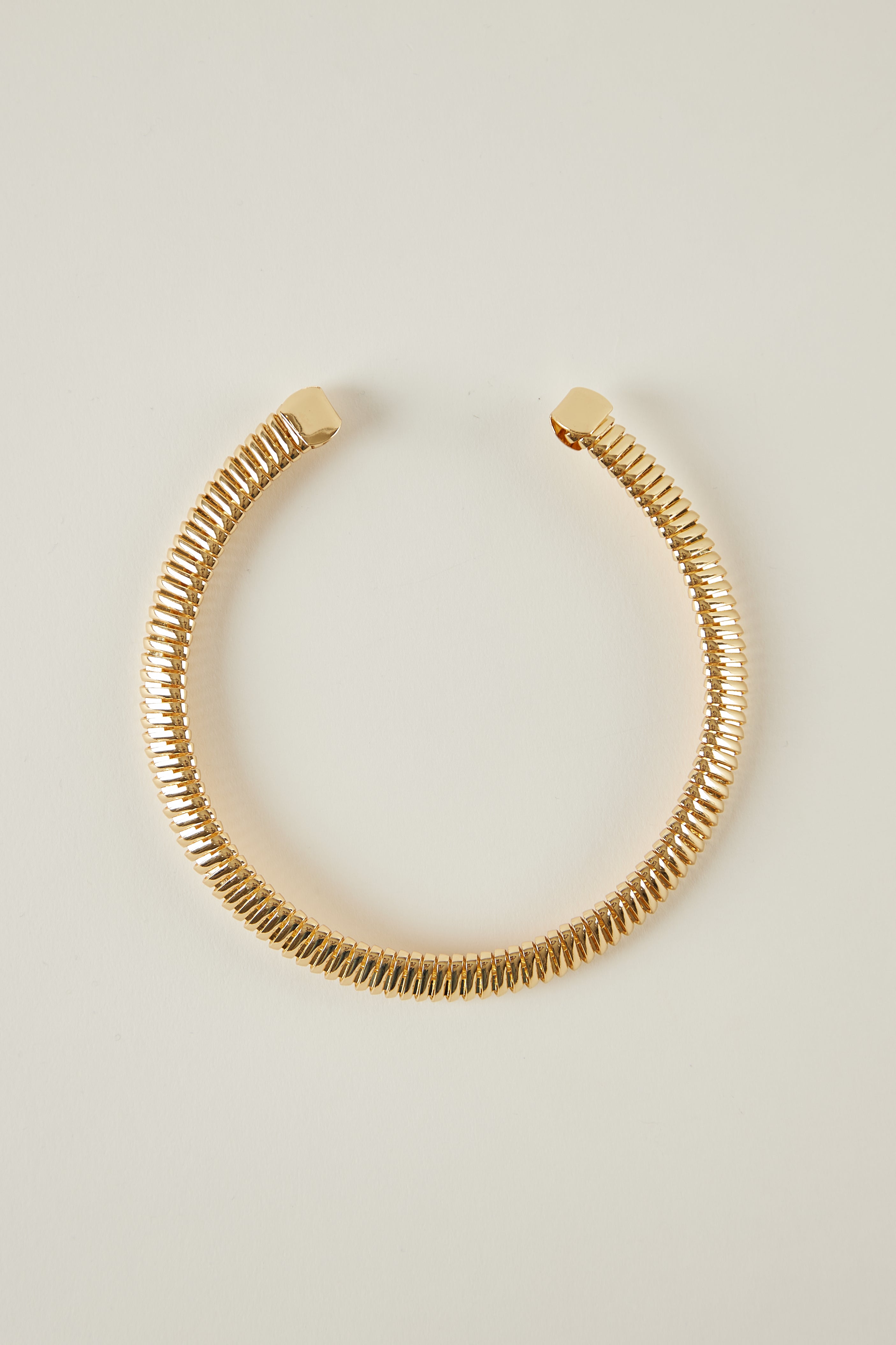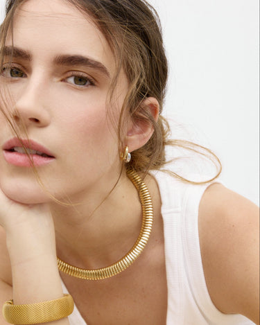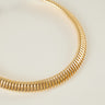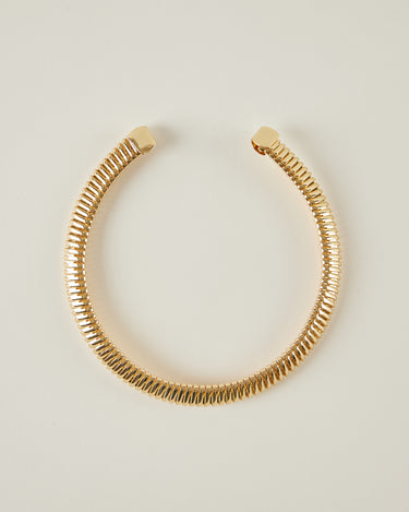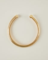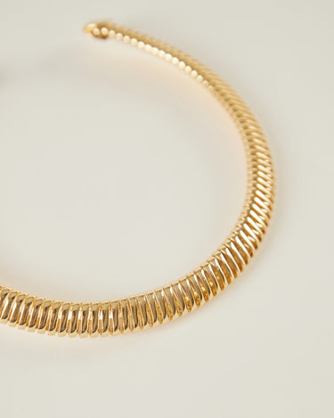 Collar rígido con acabado dorado y diseño abierto. La pieza presenta una superficie texturizada formada por pequeños relieves repetidos que recorren todo el collar, creando un efecto de volumen y brillo.