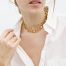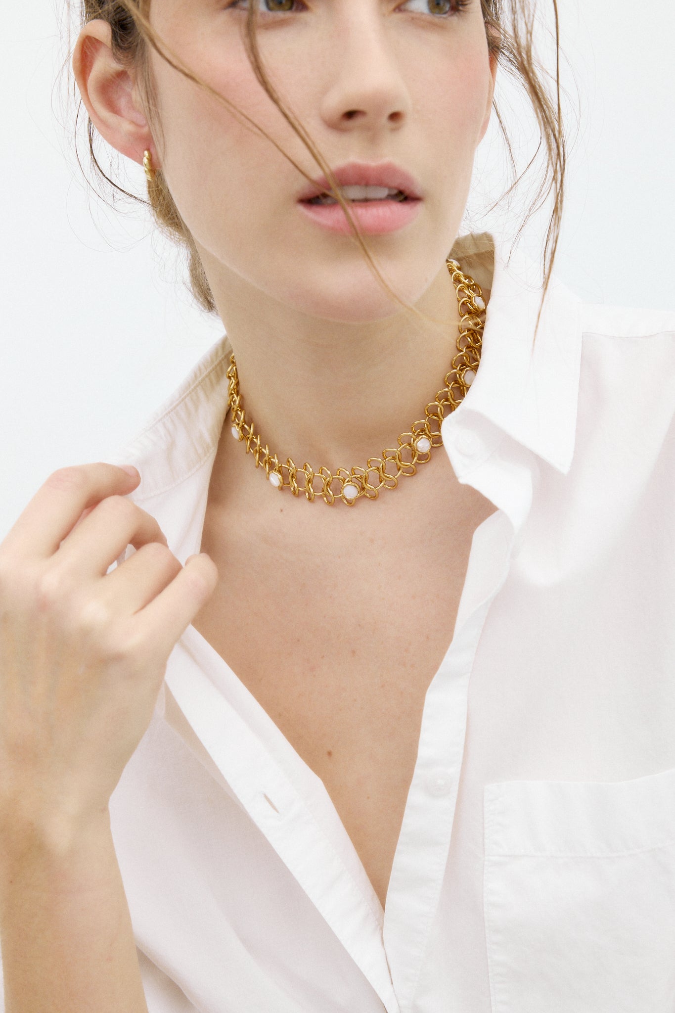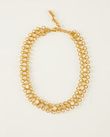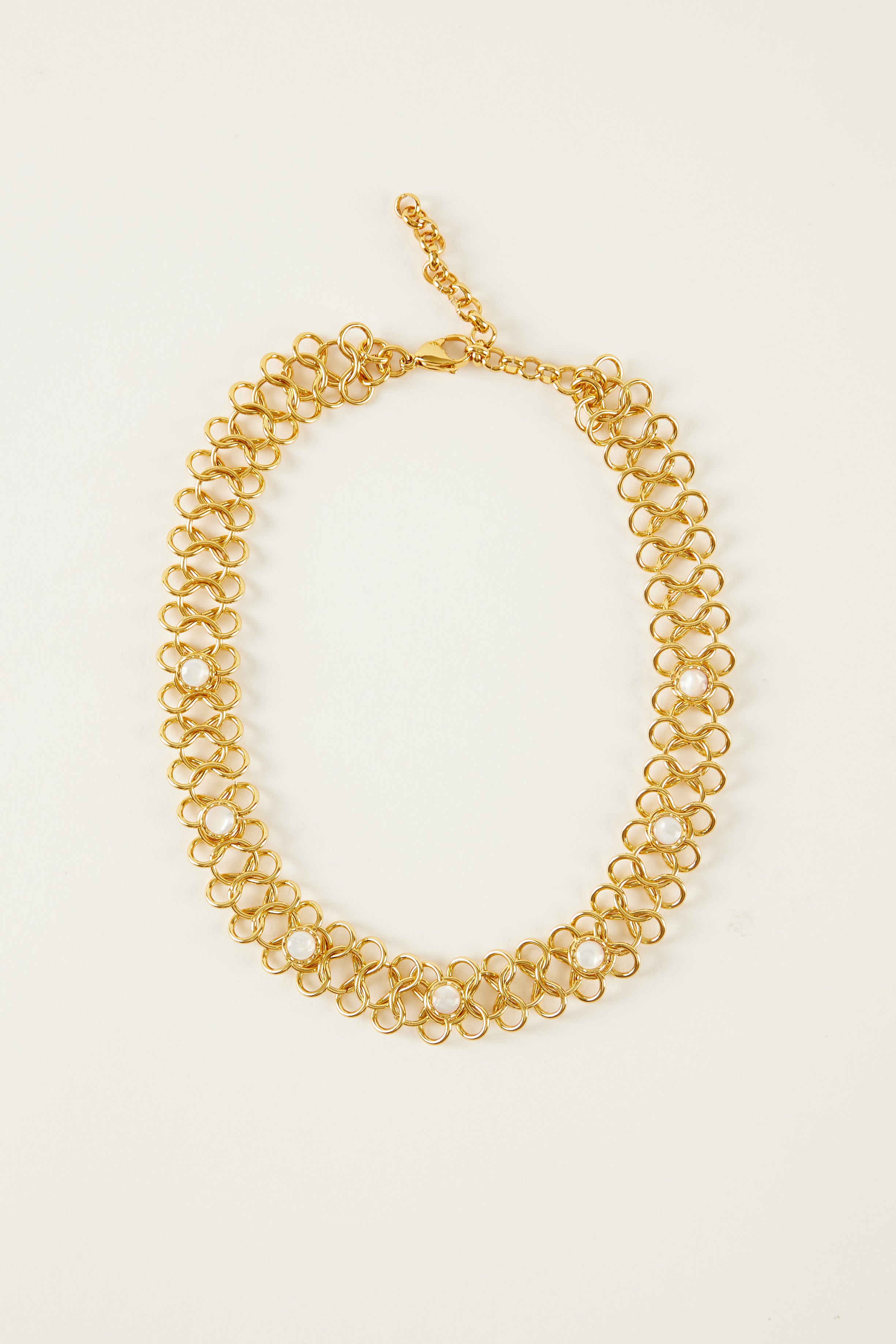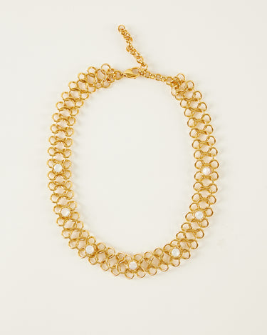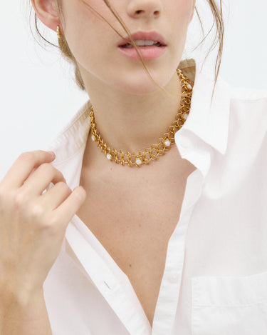 Collar/choker de eslabones dorados entrelazados, creando un diseño de malla. A lo largo del collar, lleva incrustadas varias piedras naturales.