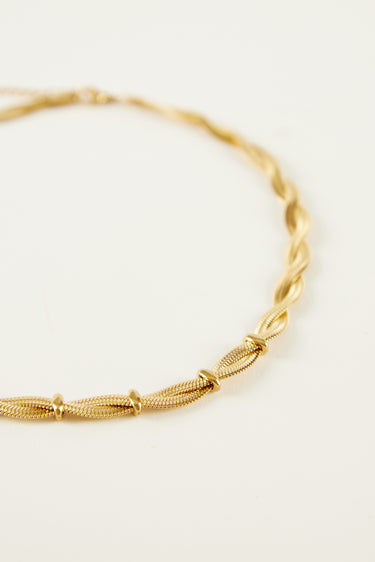 Collar de diseño trenzado compuesto por varias cadenas finas entrelazadas que crean una textura fluida y con volumen. El diseño se completa con pequeños aros metálicos que unen los tramos de la cadena.