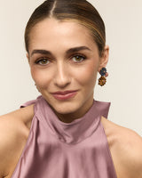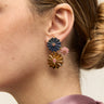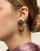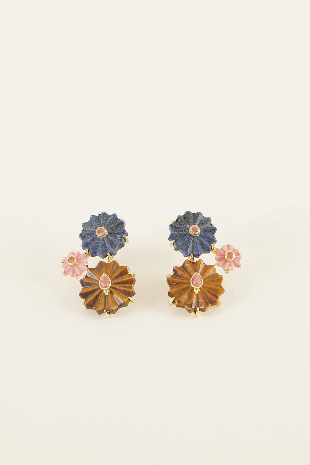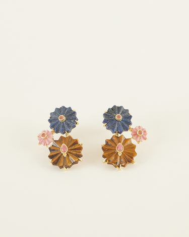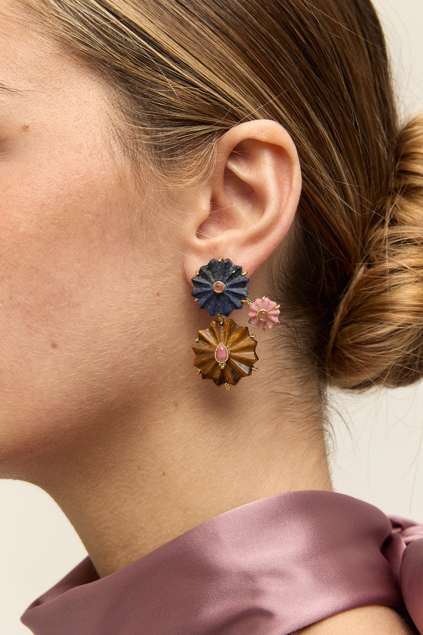 Pendientes con un diseño de flores talladas que irradian color y textura. Cada pendiente presenta tres flores unidas en un montaje dorado, destacando por el uso de piedras naturales talladas con efecto plisado.