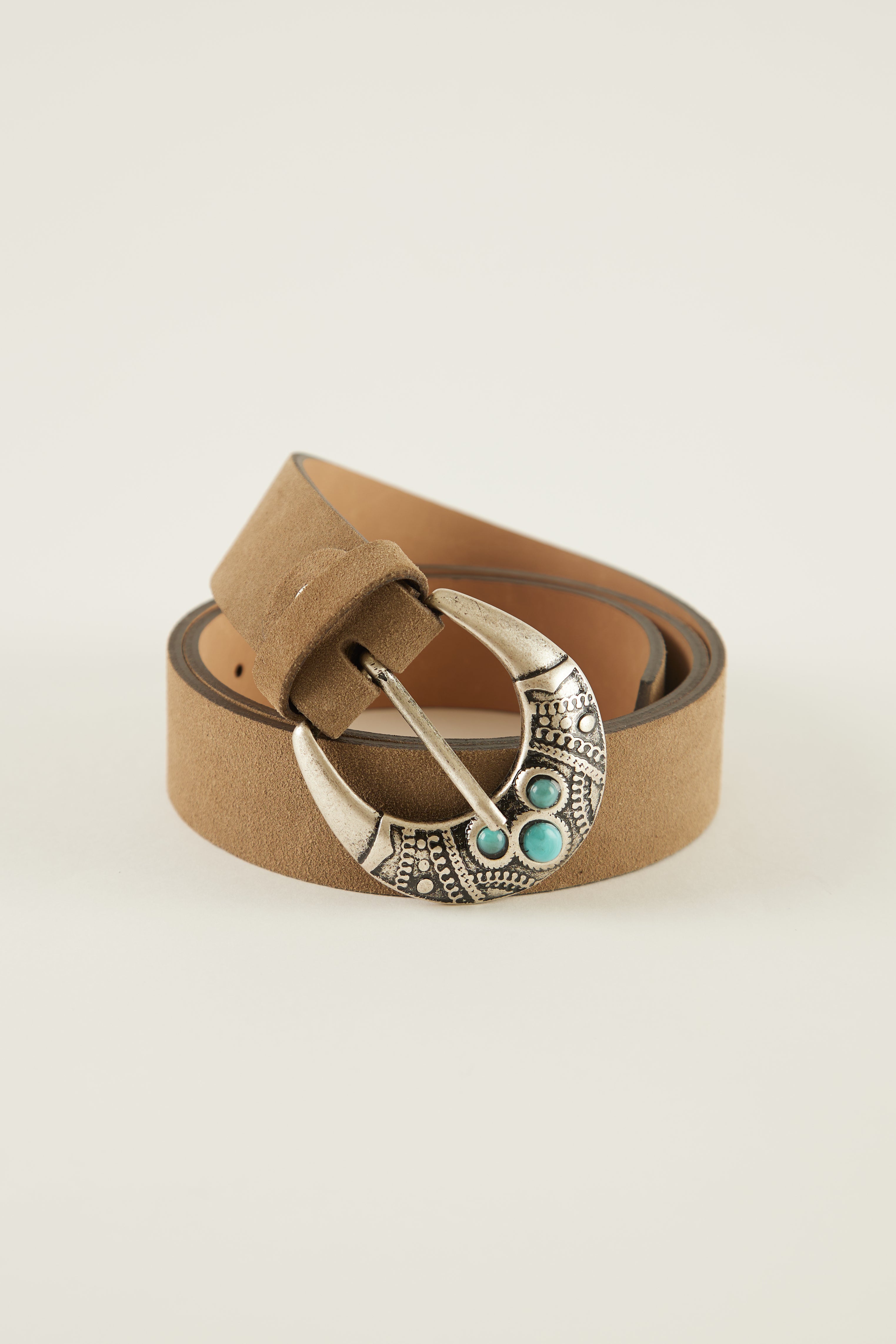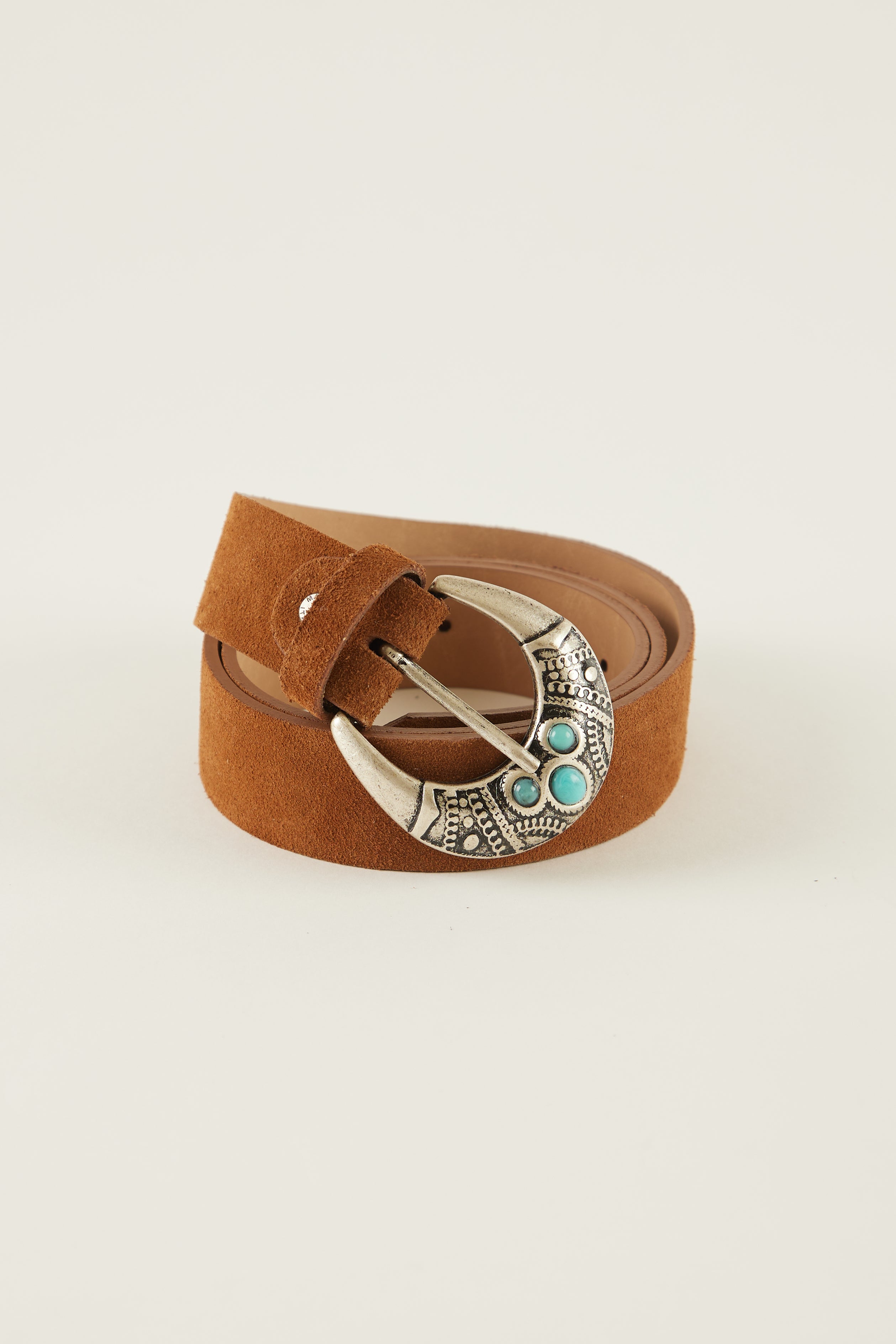 Cinturón de piel con hebilla metálica y detalle piedra.