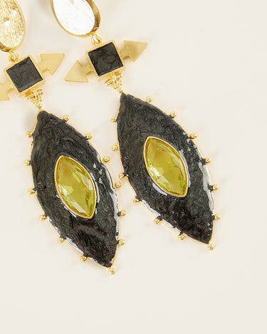 Pendientes largos que combina piezas geométricas, comenzando por una lágrima dorada de acabado cepillado, con un conector negro y dorado con flechas laterales, que da paso al colgante principal: una forma de ojo con esmaltado negro, con un cristal verde en el medio.