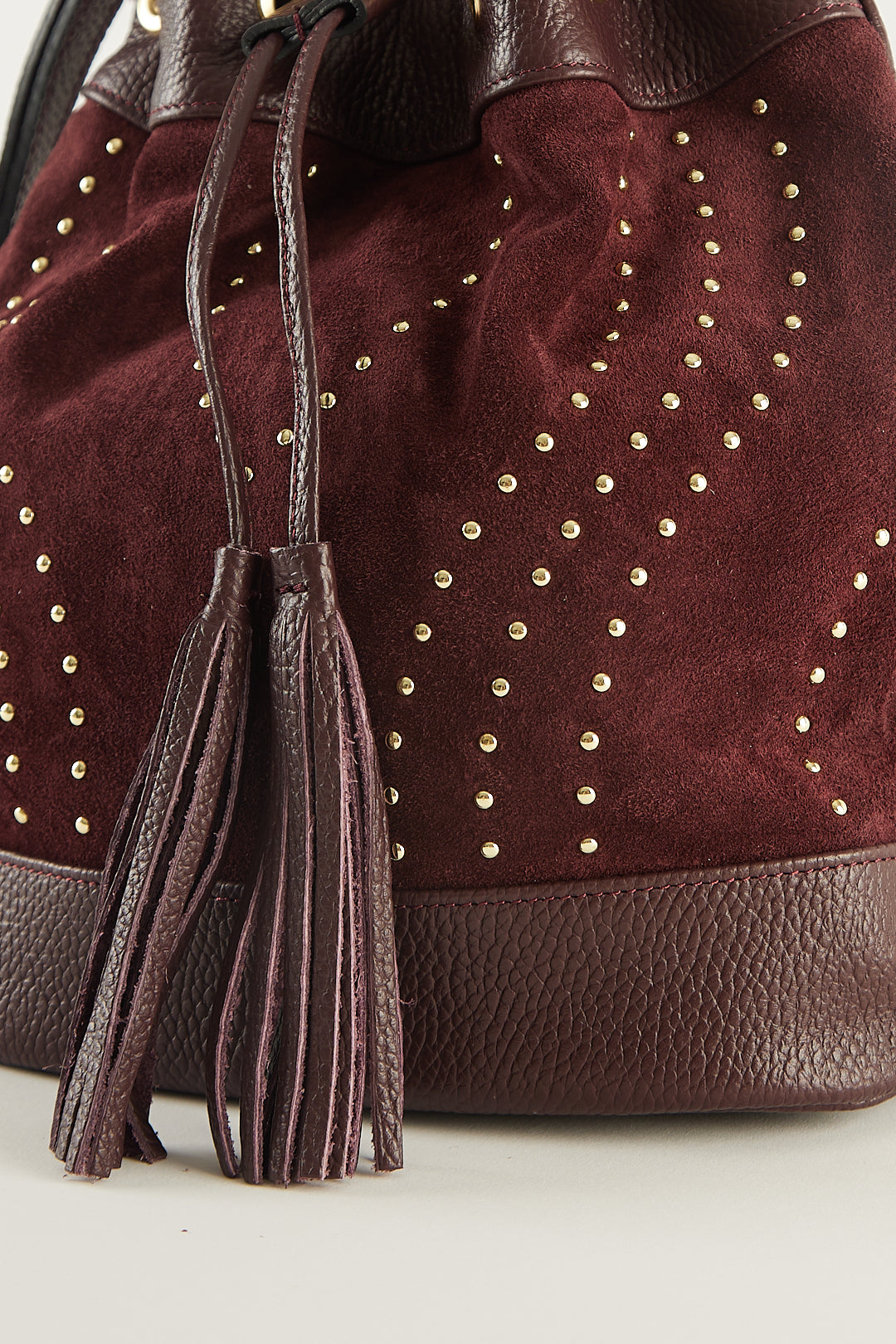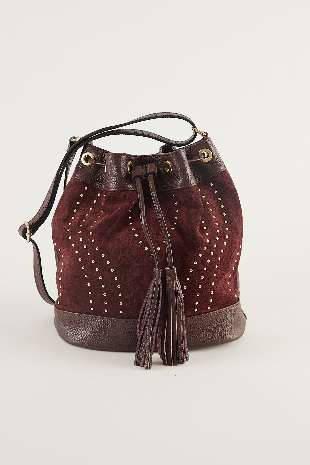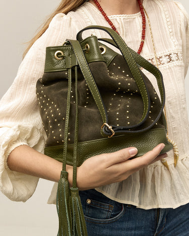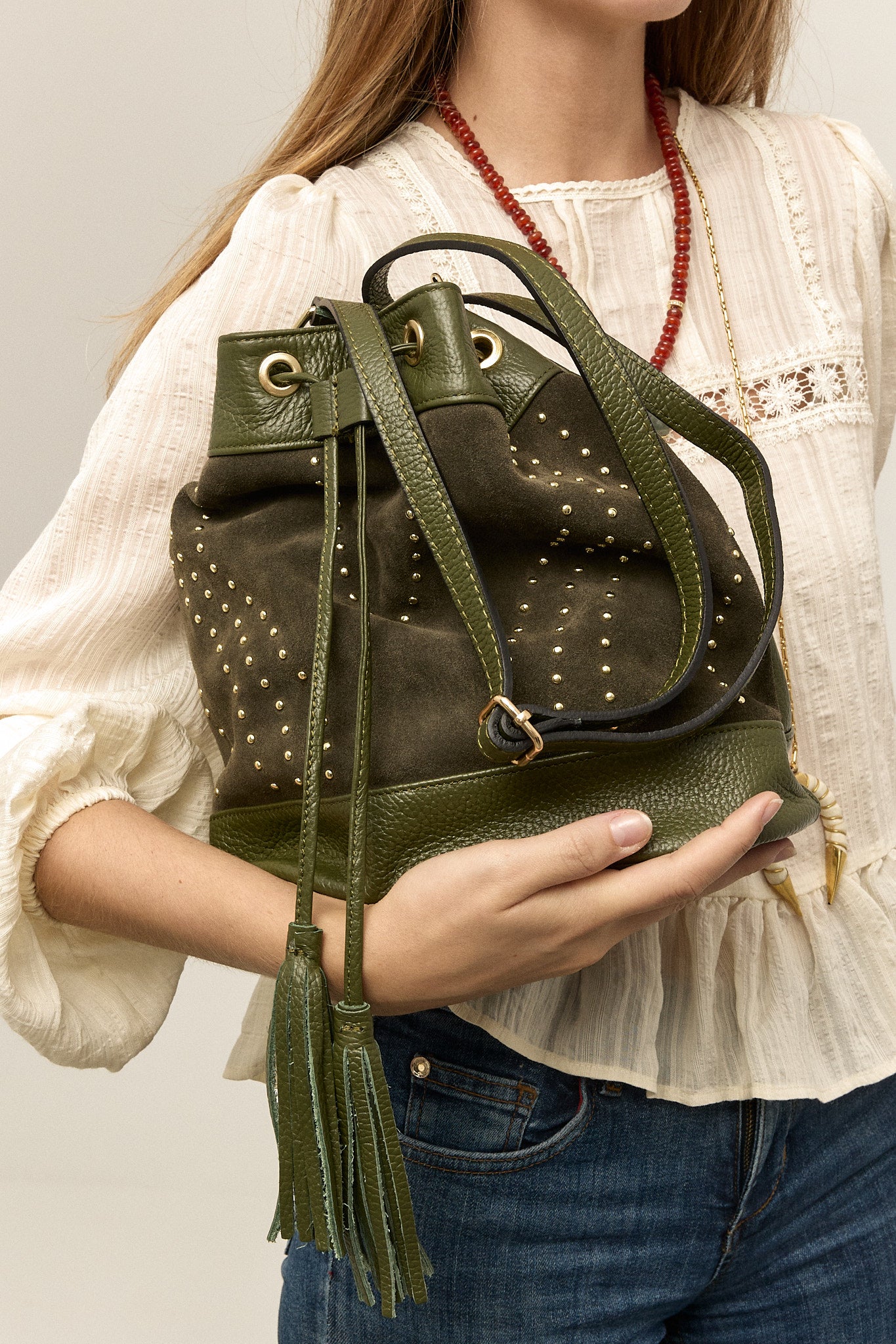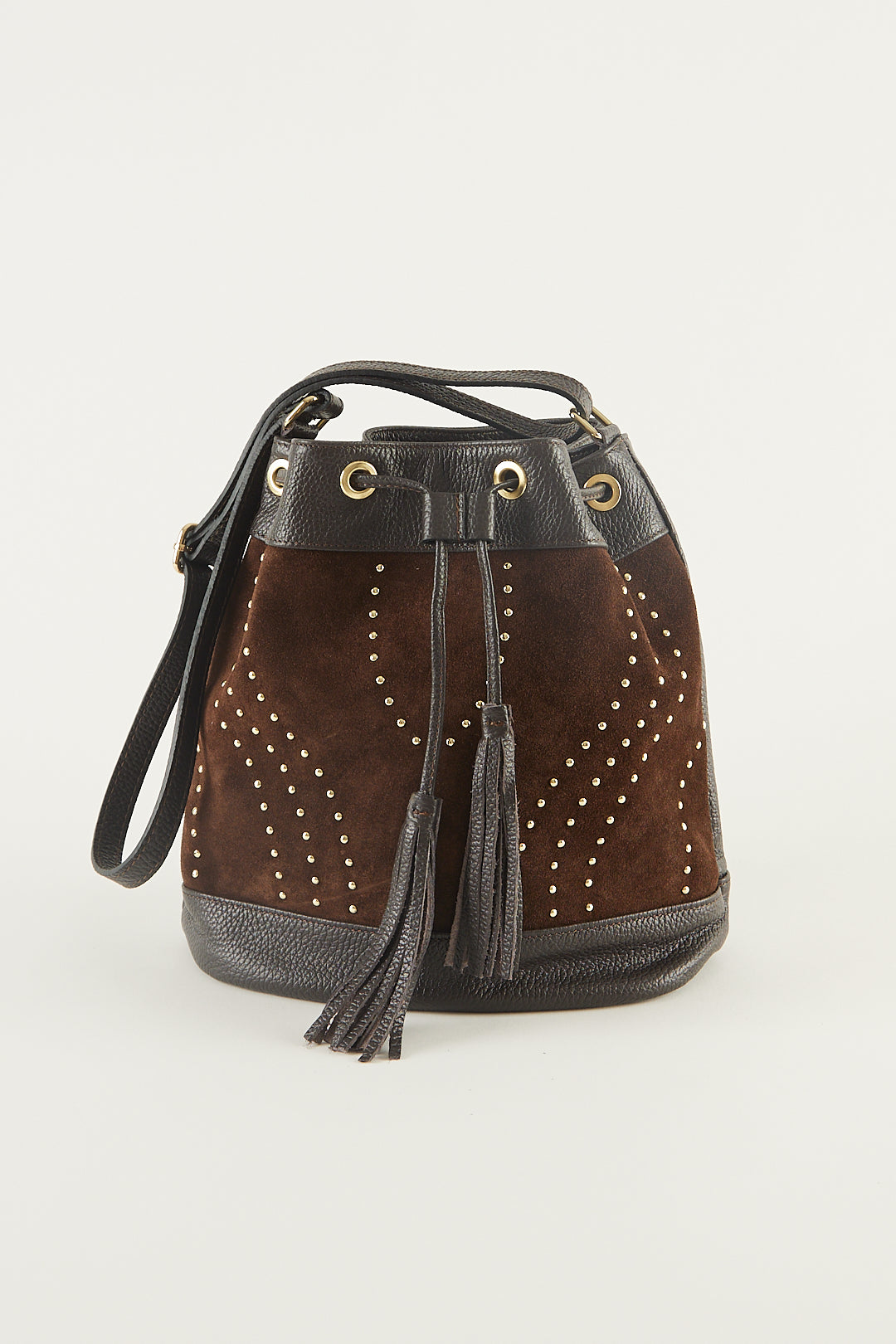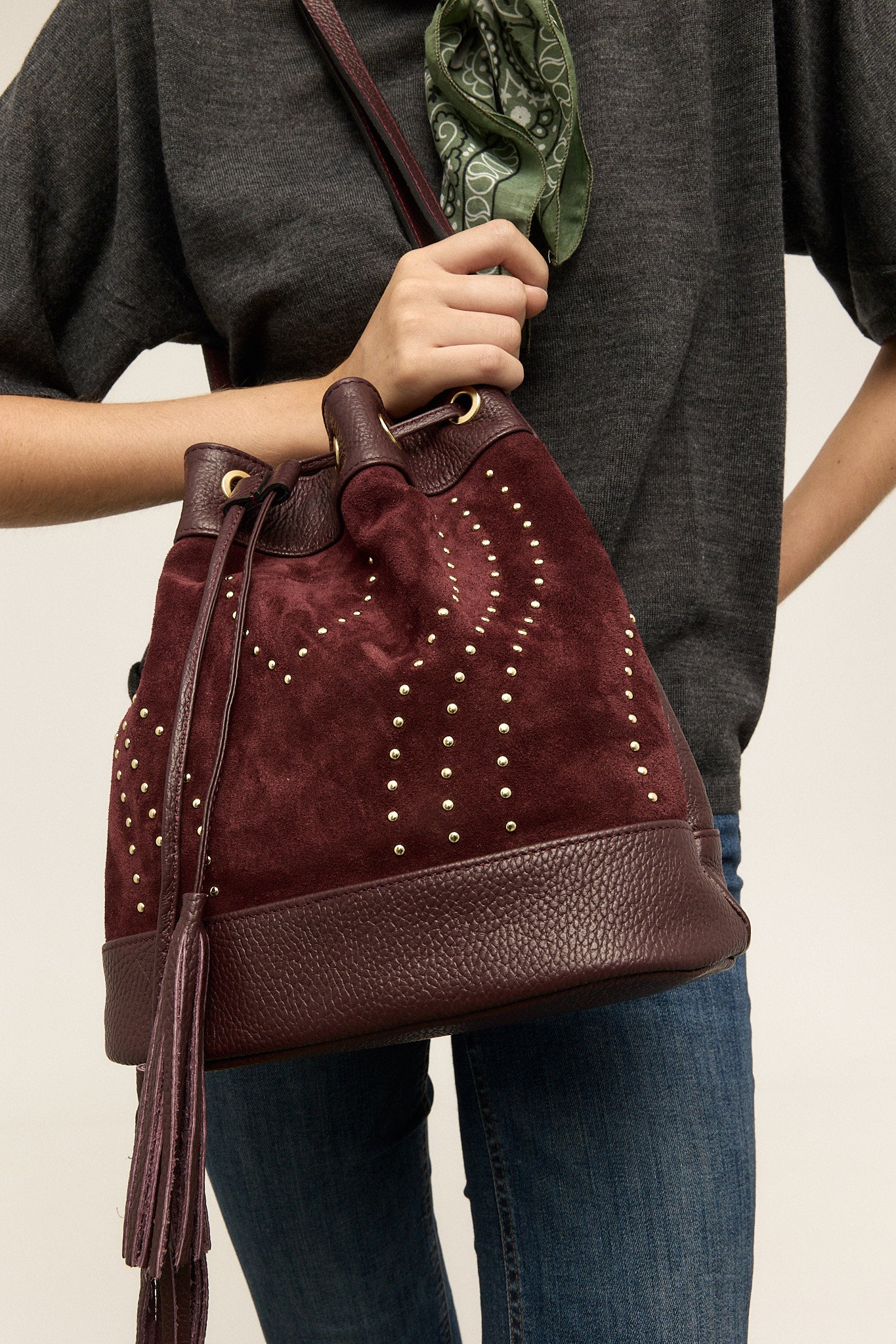 Bolso 100% de piel y ante con detalles circulares metálicos, estilo bombonera. Este modelo cuenta con un asa larga adaptable; que convierten este modelo en un aliado perfecto para cualquier tipo de outfit. Todos los detalles metálicos son de acero inoxidable acabado oro.