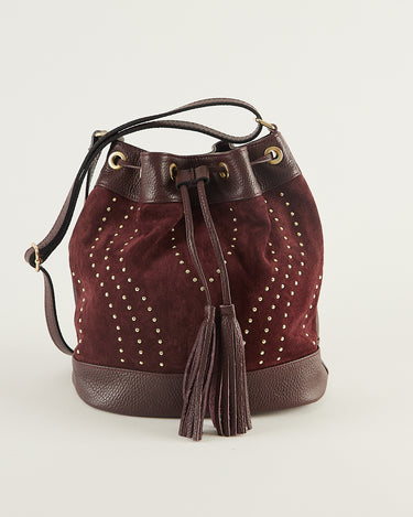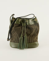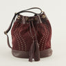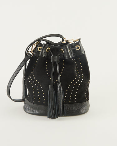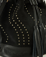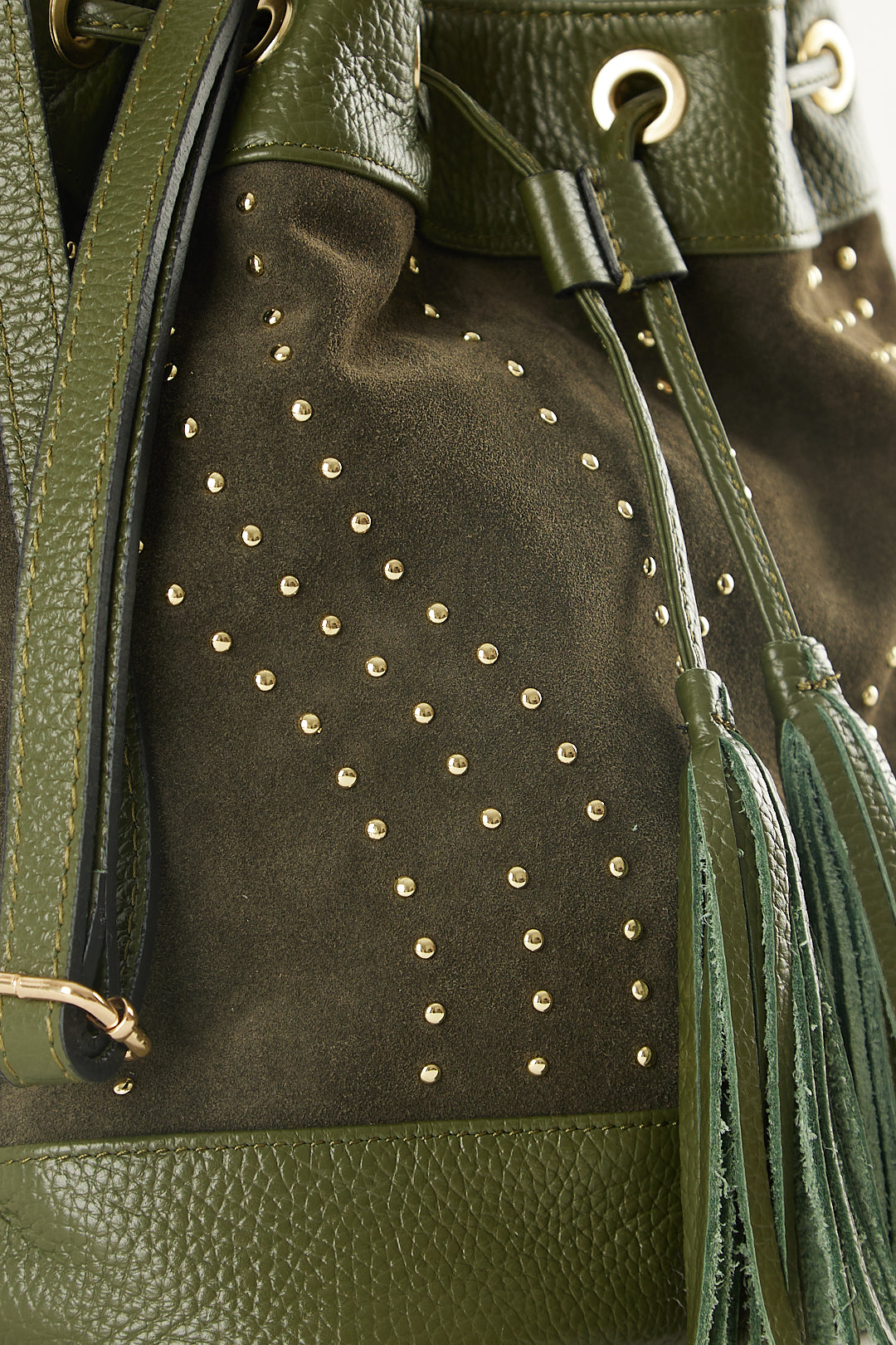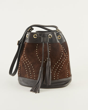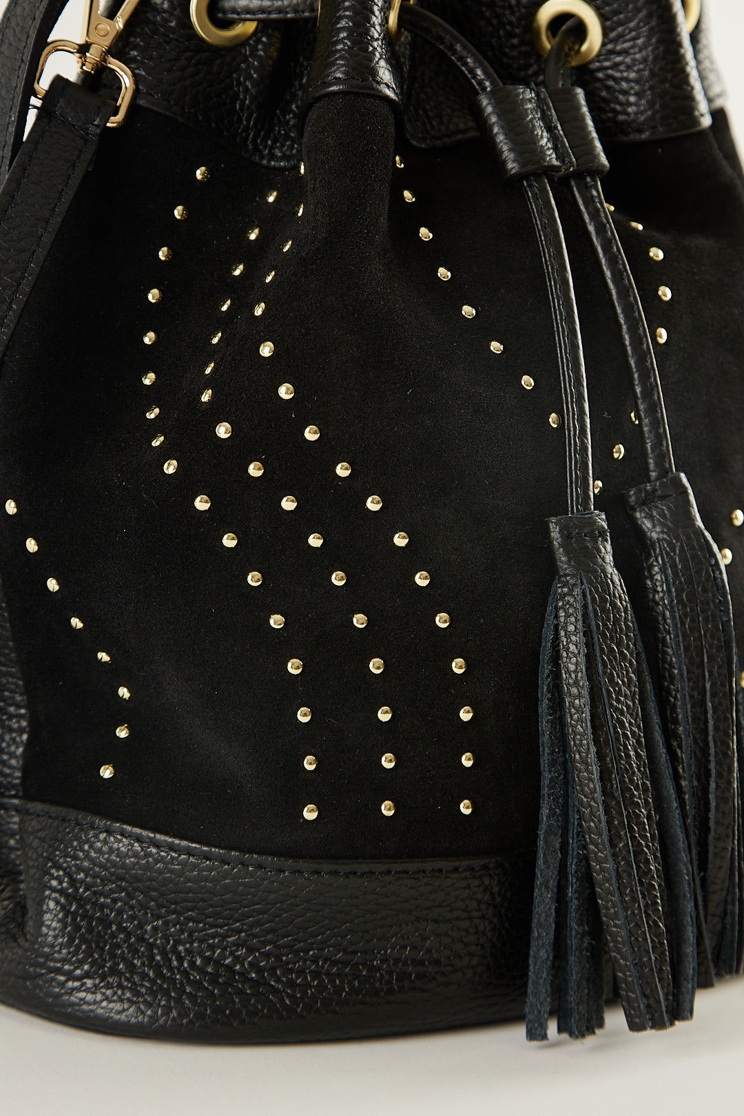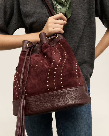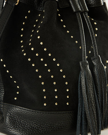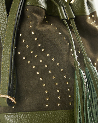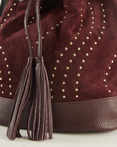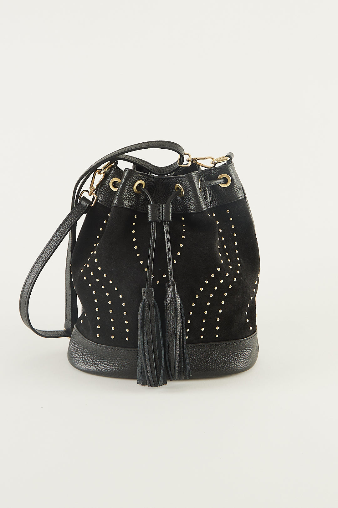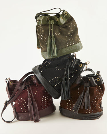 Bolso 100% de piel y ante con detalles circulares metálicos, estilo bombonera. Este modelo cuenta con un asa larga adaptable; que convierten este modelo en un aliado perfecto para cualquier tipo de outfit. Todos los detalles metálicos son de acero inoxidable acabado oro.