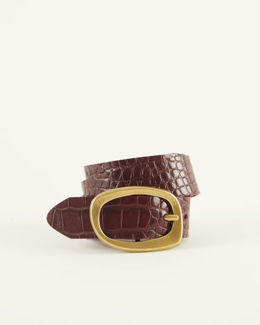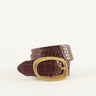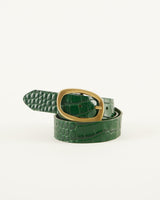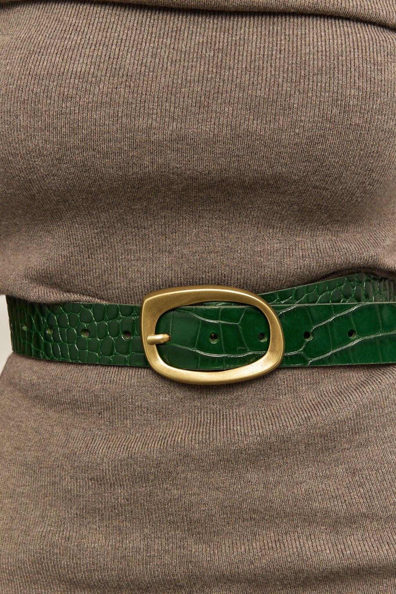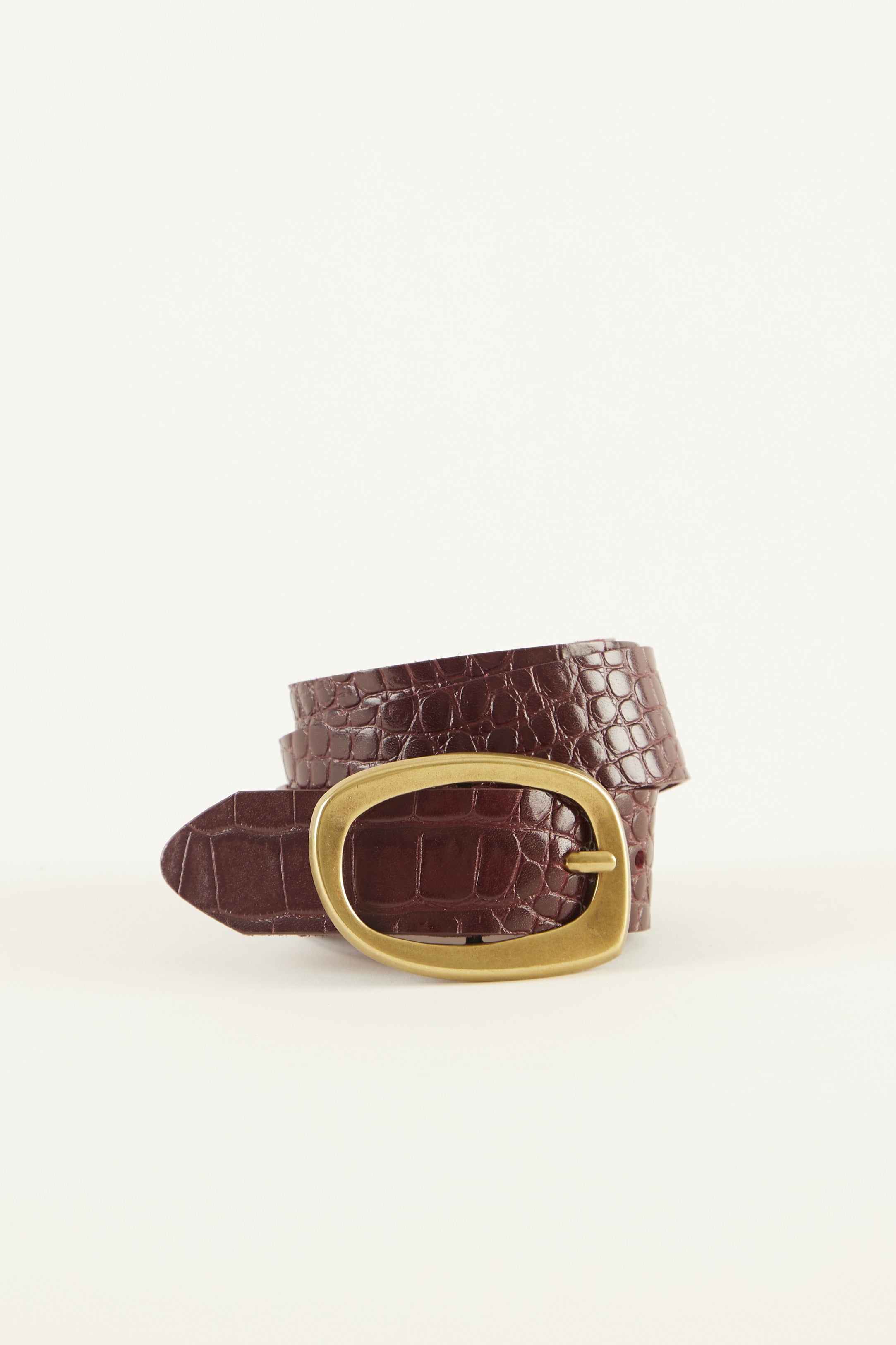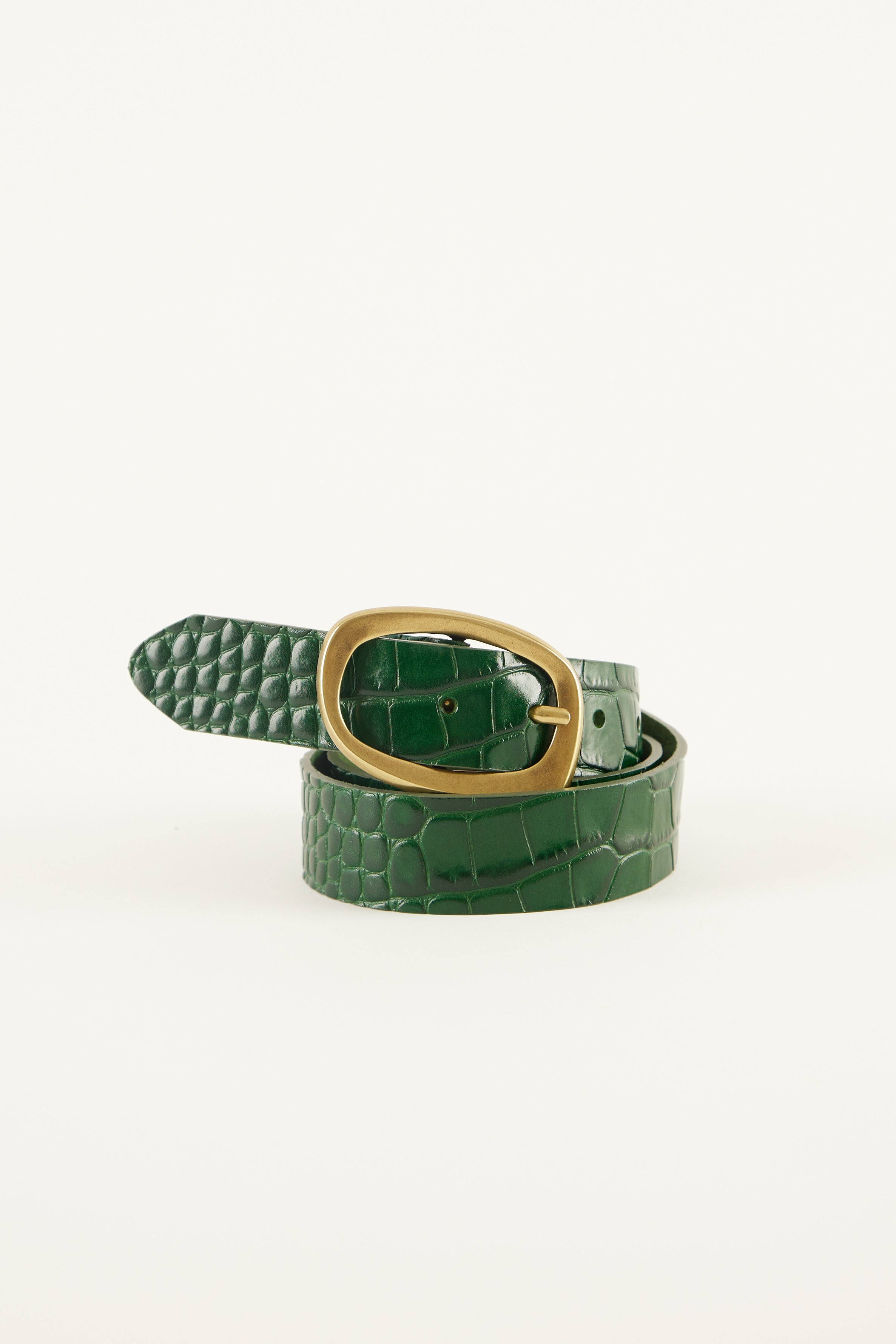Cinturón de piel con hebilla metálica ovalada. Piel efecto y textura de cocodrilo.