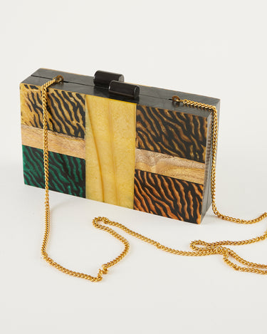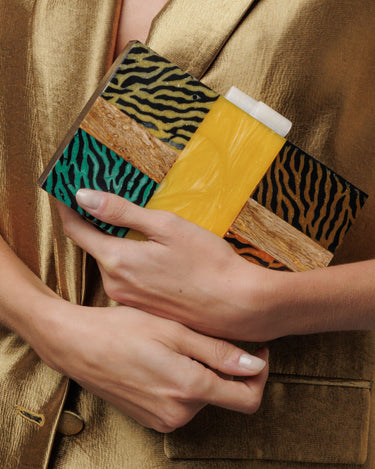 Bolso estilo clutch con acabado nácar animal print. El complemento perfecto para cualquier evento u ocasión especial. Su cierre magnético lo convierte en un modelo muy cómodo de llevar.