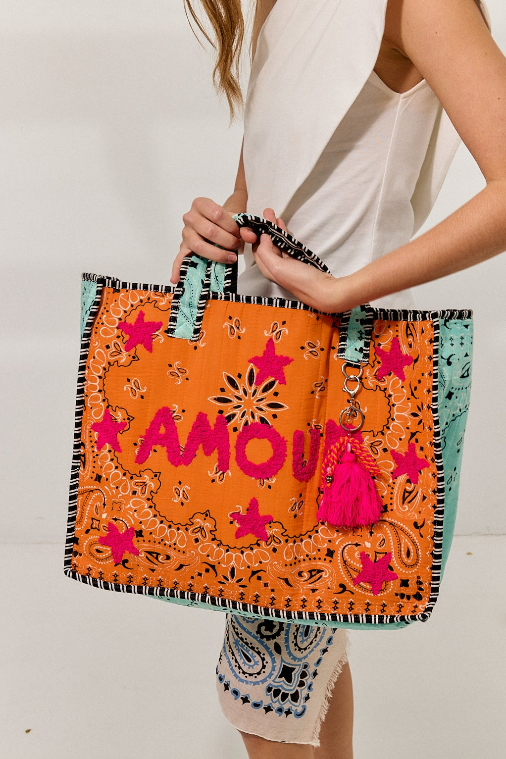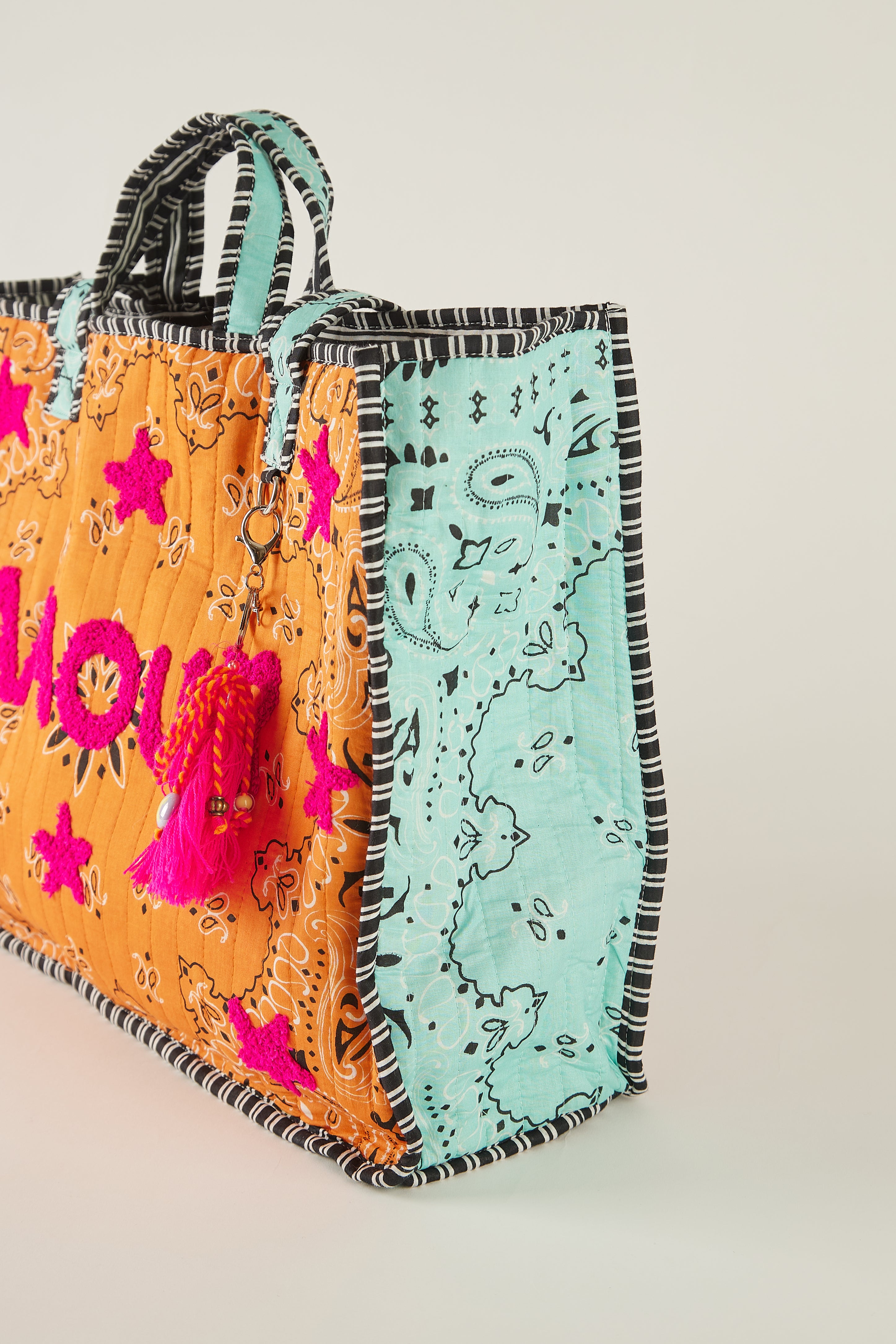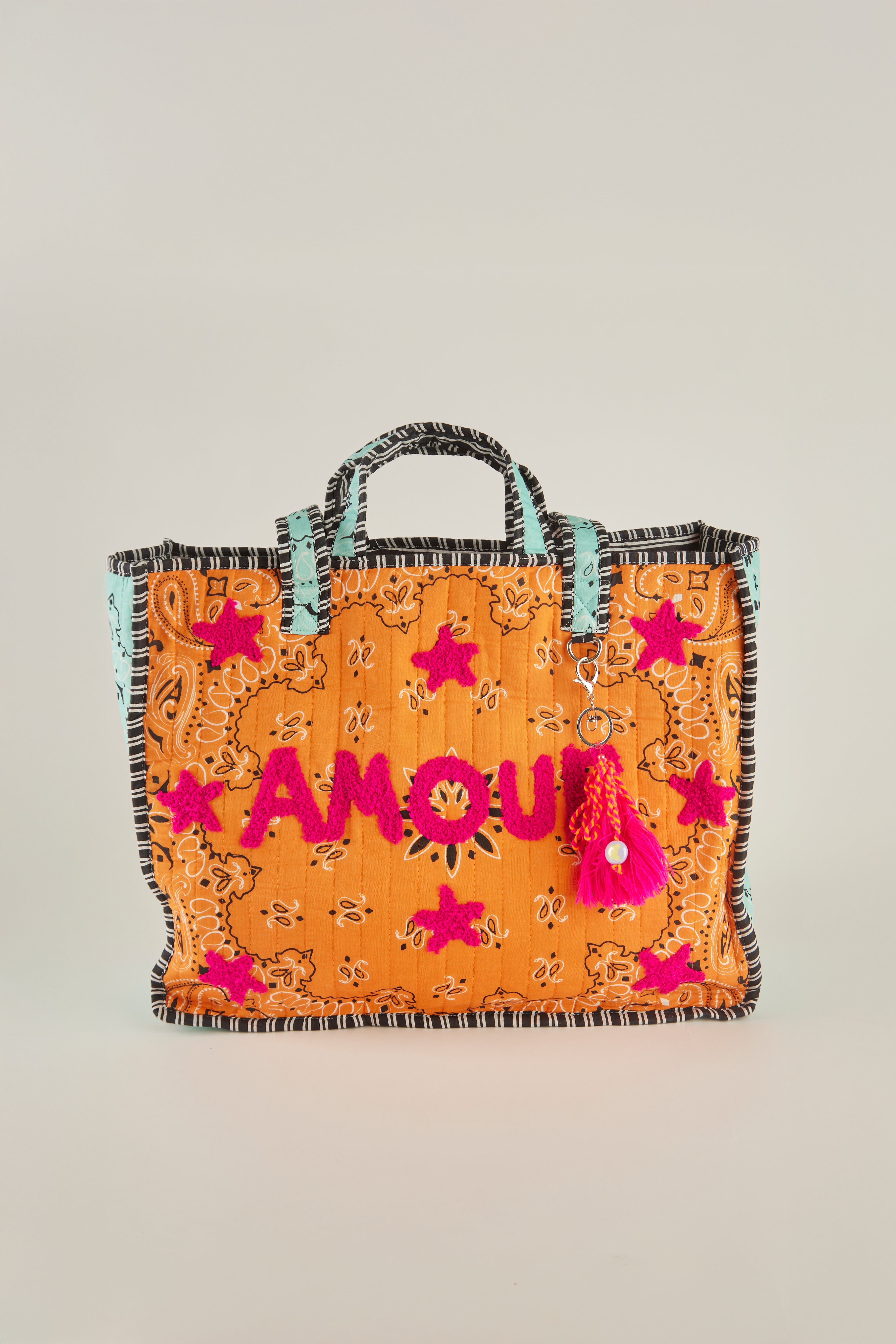 Incorpora asas cortas reforzadas, ribetes estampados en negro y un charm decorativo con borlas y cuentas.