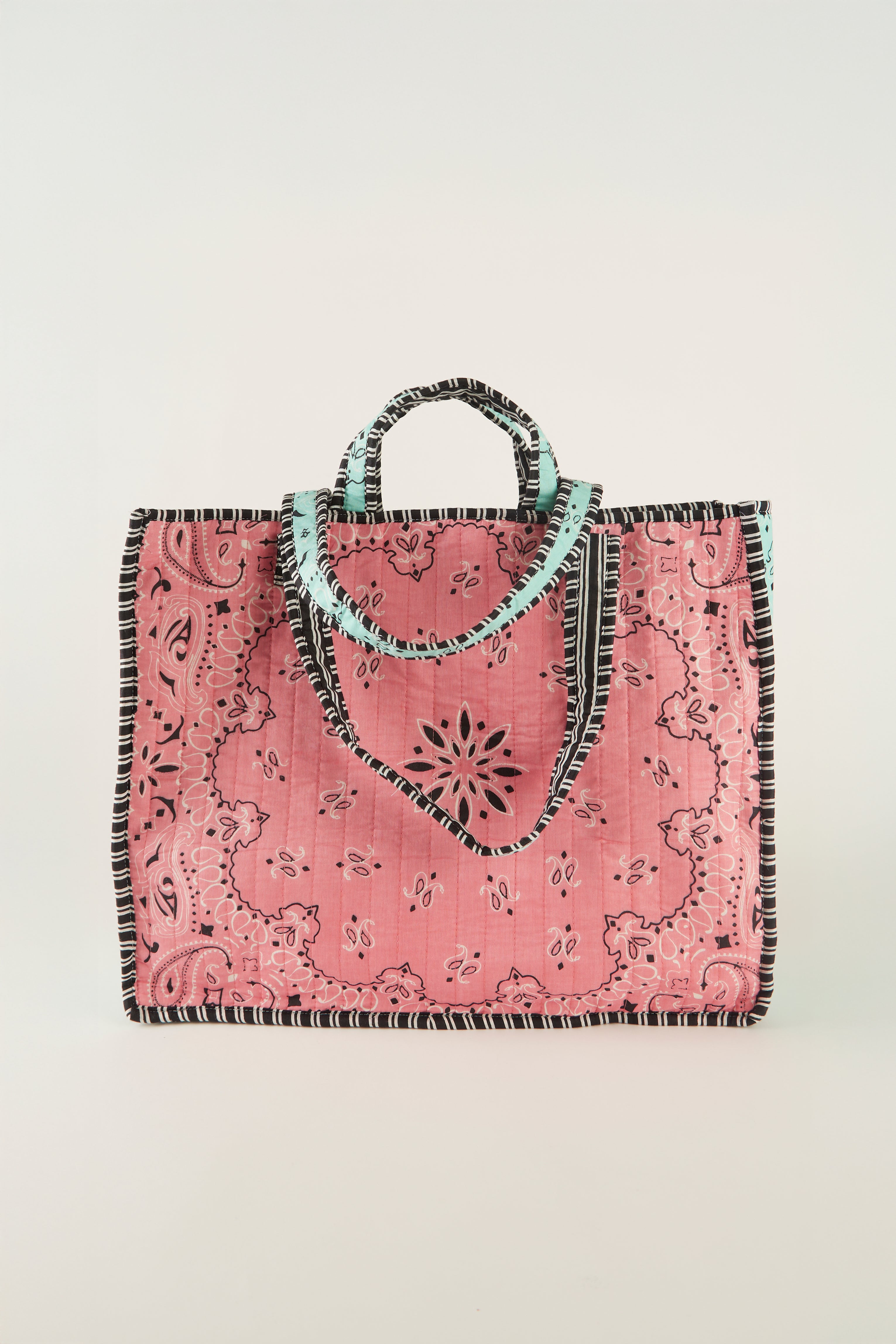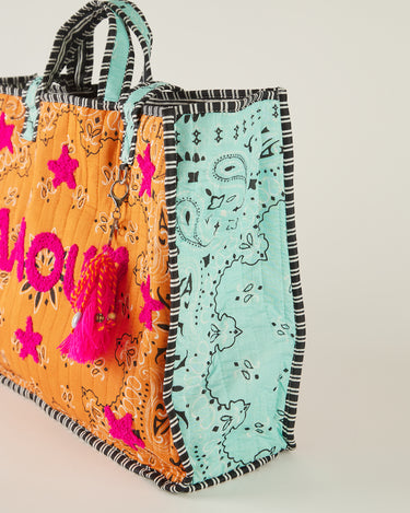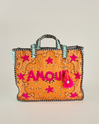 Bolso acolchado con estampado tipo bandana en tono naranja.