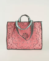 Su diseño estructurado se combina con detalles bordados en relieve en color fucsia, creando contraste y textura.