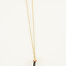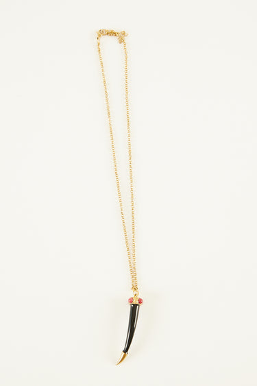 Collar corto de cadena dorada, con colgante en forma de cuerno de resina, con punta dorada y la parte superior adornada con pequeñas piedras naturales.