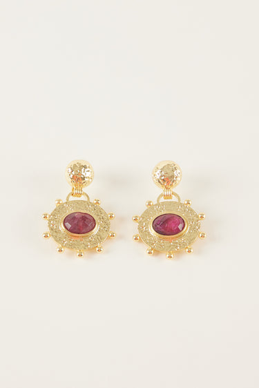 Pendientes cortos dorados, con piedra natural central, enmarcada por detalles dorados efecto amartillado y bolitas doradas.