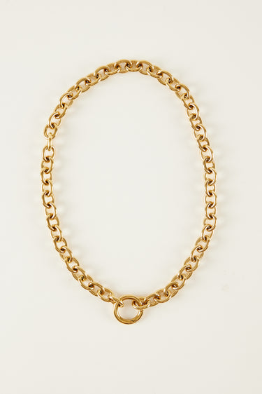 Cadena de acero larga con acabado en dorado.