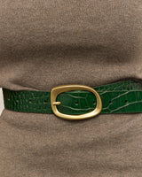 Cinturón de piel con hebilla metálica ovalada. Piel efecto y textura de cocodrilo.